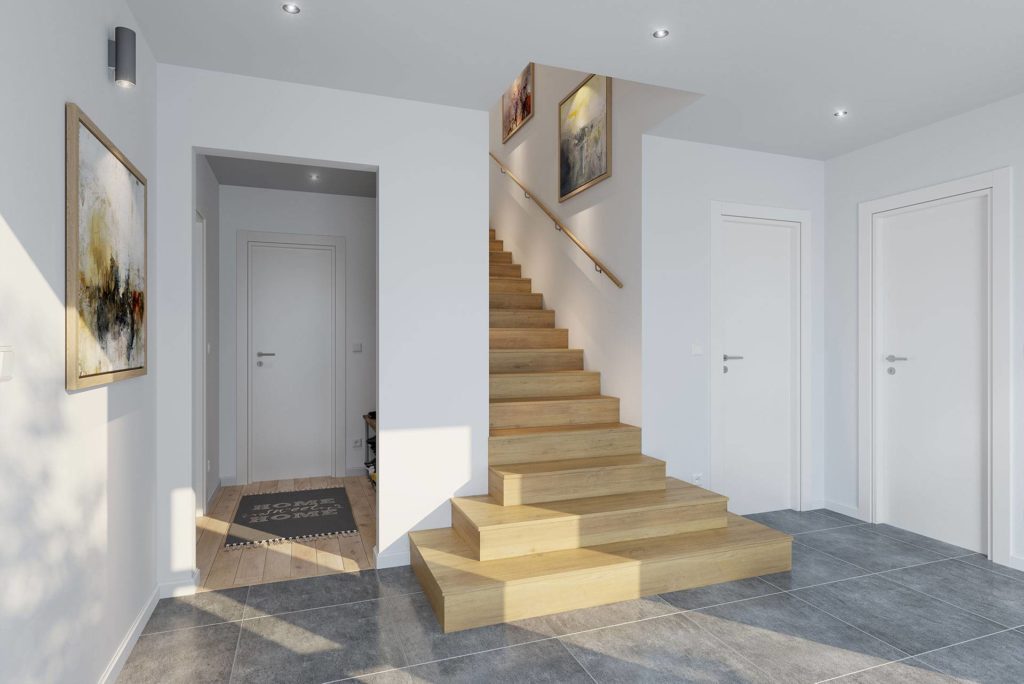 Das Citylife 148 edition verfügt mit seiner mittigen und repräsentativ gestalteten Treppe über eine großen Dielenbereich mit angeschlossener Garderobe, einem Gäste-WC und einem Hauswirtschaftsraum.