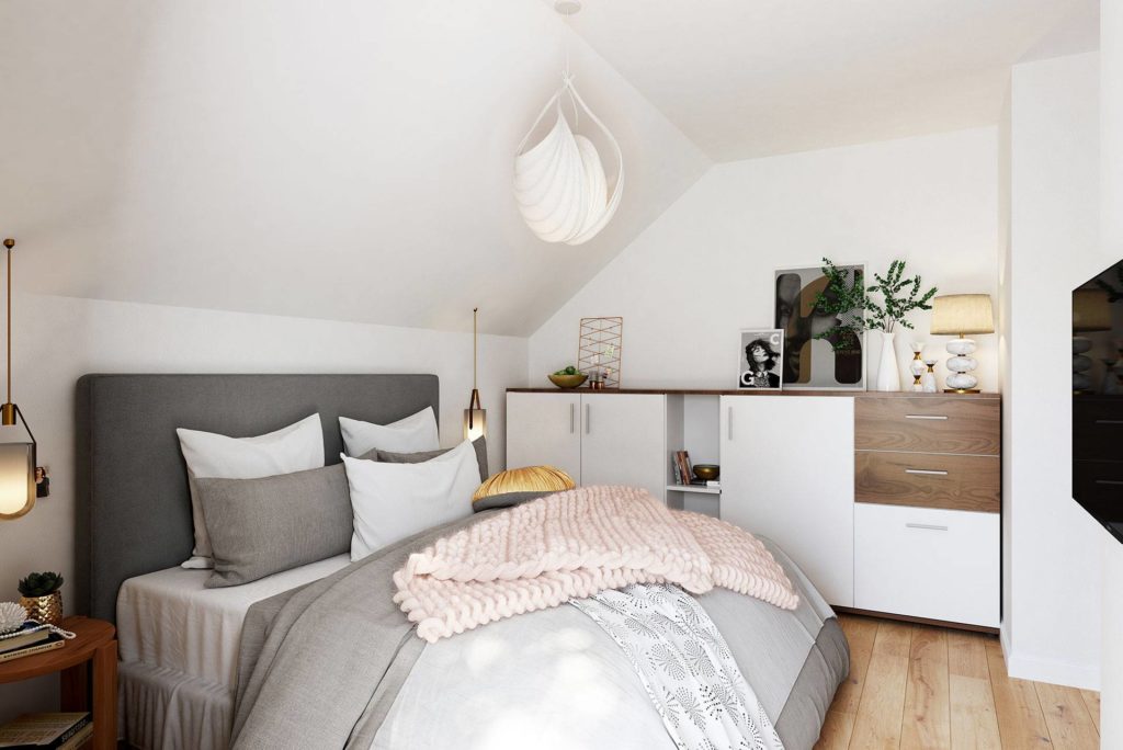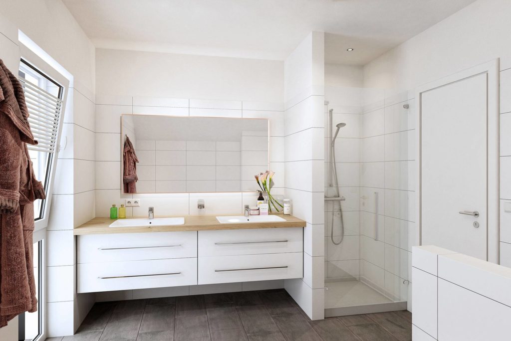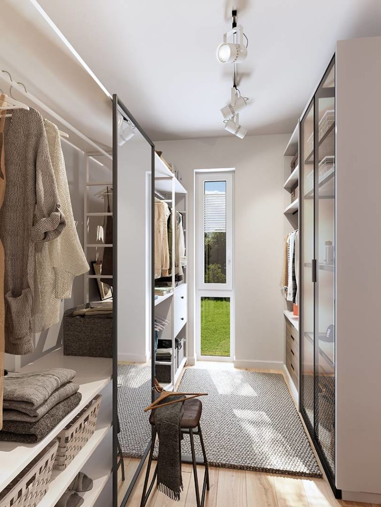 Wie bekommt man ein immer aufgeräumtes Schlafzimmer auf angenehme Art? Mit einem Ankleidezimmer. In unserer Noblesse-Serie ist dieses direkt dem Schlafzimmer angeschlossen. Sollte einer der Bauherren am Wochenende das Privileg haben, länger schlafen zu können, kann der andere auf leisen Sohlen über die Ankleide das Zimmer verlassen und niemand wird wach. In einem offenen Schranksystem entsteht außerdem bei gleicher Größe viel mehr Staufläche als dieser in Schränken zur Verfügung steht. Einfach praktisch.