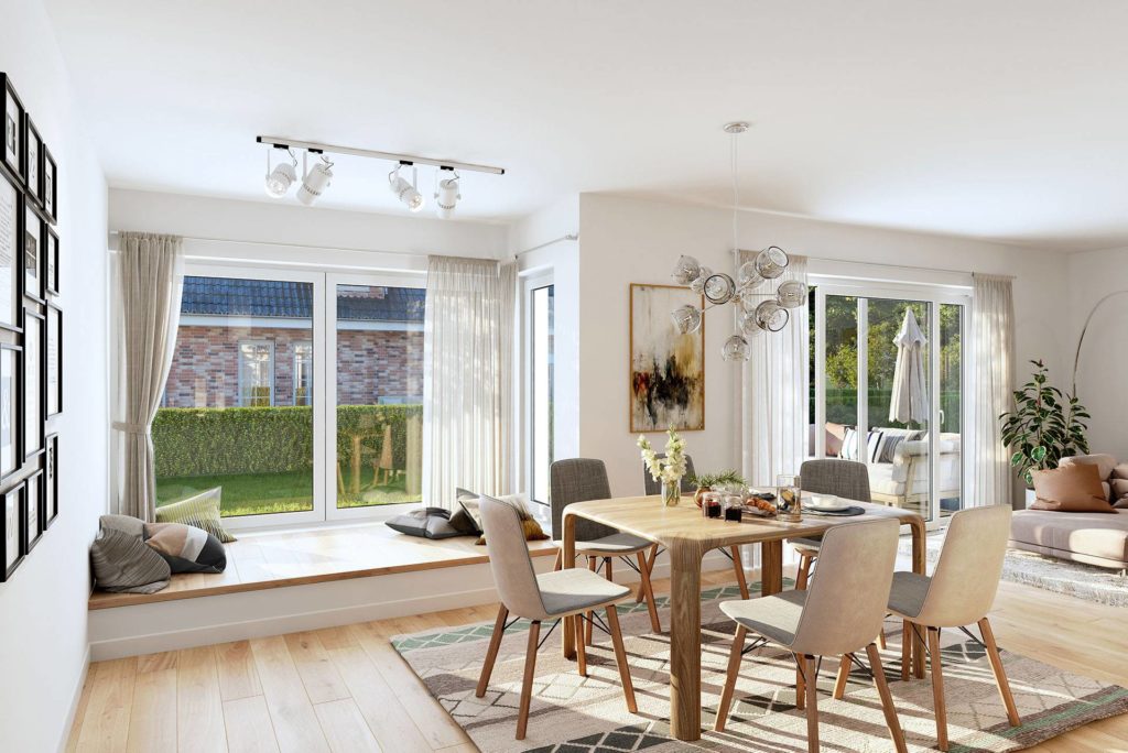 Ein Clou des Noblesse 142 edition ist die in das Esszimmer integrierte Sitzecke, die perfekt gefüllt werden kann durch den bauseitigen Einbau einer Bank. Sie wird der Kuschelbereich Ihres neuen Hauses werden, der auch an kalten Wintertagen ein wohlig-warmes Plätzchen im Garten bereitet.